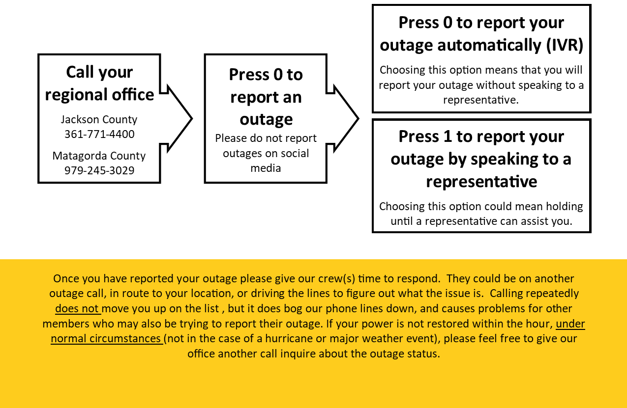 JEC crews will be on standby overnight to respond to outages throughout our system. If you experience a power outage, we ask that you call one of our offices so that a dispatcher can assist you. During widespread outages and after hours, our automated system stakes members' calls and routes outage information to service crews more quickly than a manual call system. helping us restore your power more efficiently. Please have your METER number and PHONE number ready when you call an outage in.
